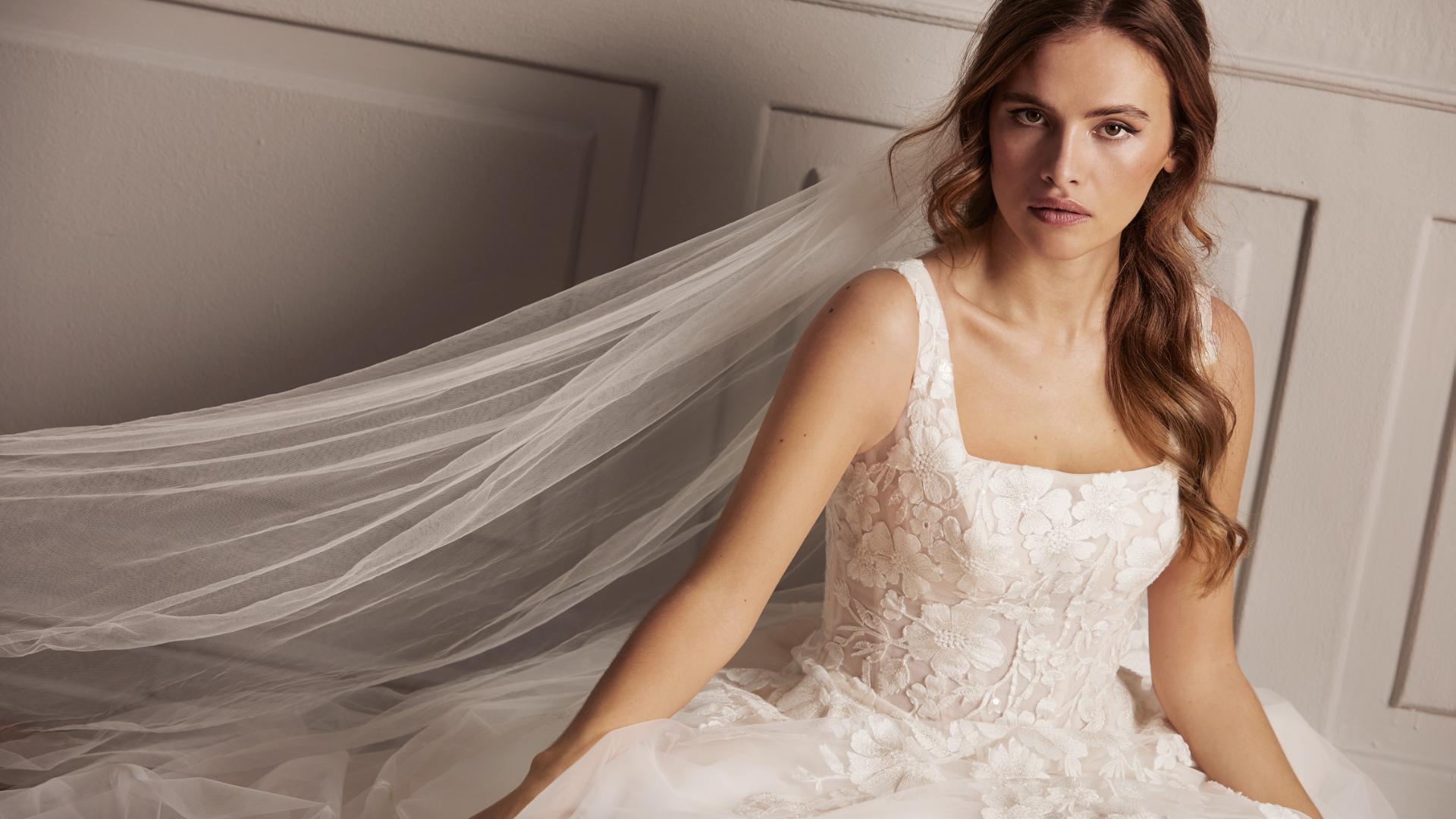 De florale blonder med store blomster motiver i sarte nuancer og blonder i petite ranker, skaber et romantisk udtryk i de nye bryllupsrober.
