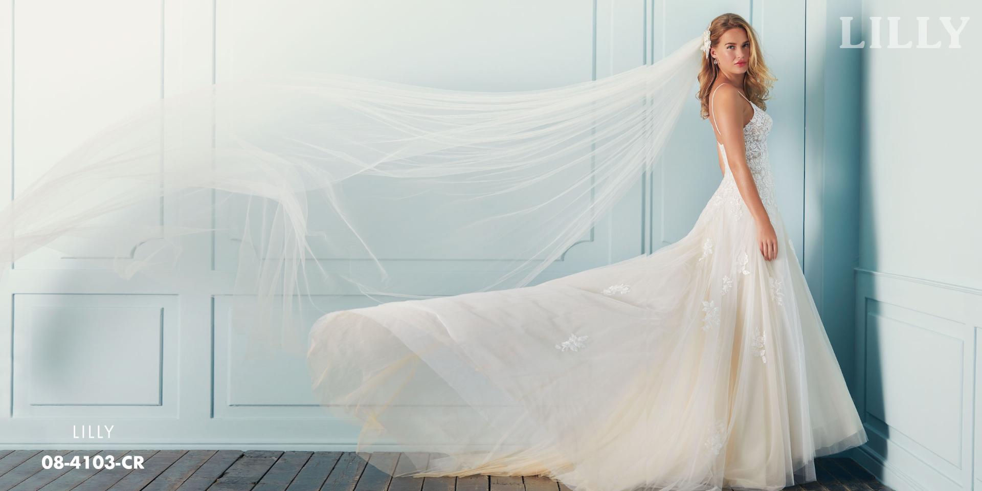 Luftig brudekjole med en blød tylsnederdel og romantisk blonde overdel med halv gennemsigtige detaljer. Kjolens V-udskæring fremhæver dekolletéen på smukkeste vis.